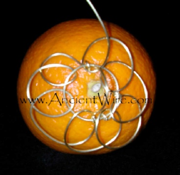 6. Continue forming new loops around the previous loops, encasing the orange with wire.