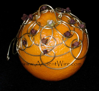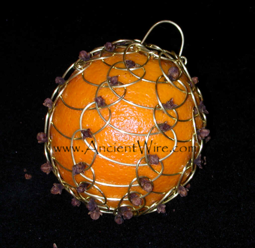 Materials: About 2 3/4" orange, cloves, and about 5 yards of 18 gauge soft brass wire.